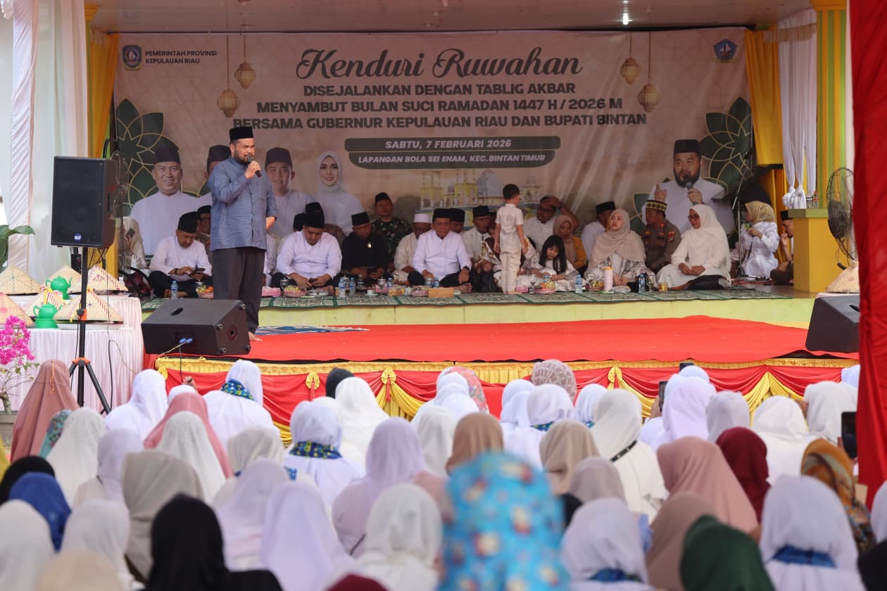 Bintan, jendelakepri.com – Gubernur Kepulauan Riau Ansar Ahmad menghadiri acara Kenduri Ruwahan dan Tabligh Akbar yang diselenggarakan Pemerintah Kabupaten Bintan untuk menyambut Bulan Suci Ramadan 1447 H / 2026 M. Kegiatan ini berlangsung khidmat di Lapangan Bola Sei Nam, Kijang, Kecamatan Bintan Timur, pada Sabtu (7/2/2026), dihadiri ribuan masyarakat setempat serta tokoh agama dan pemerintahan.