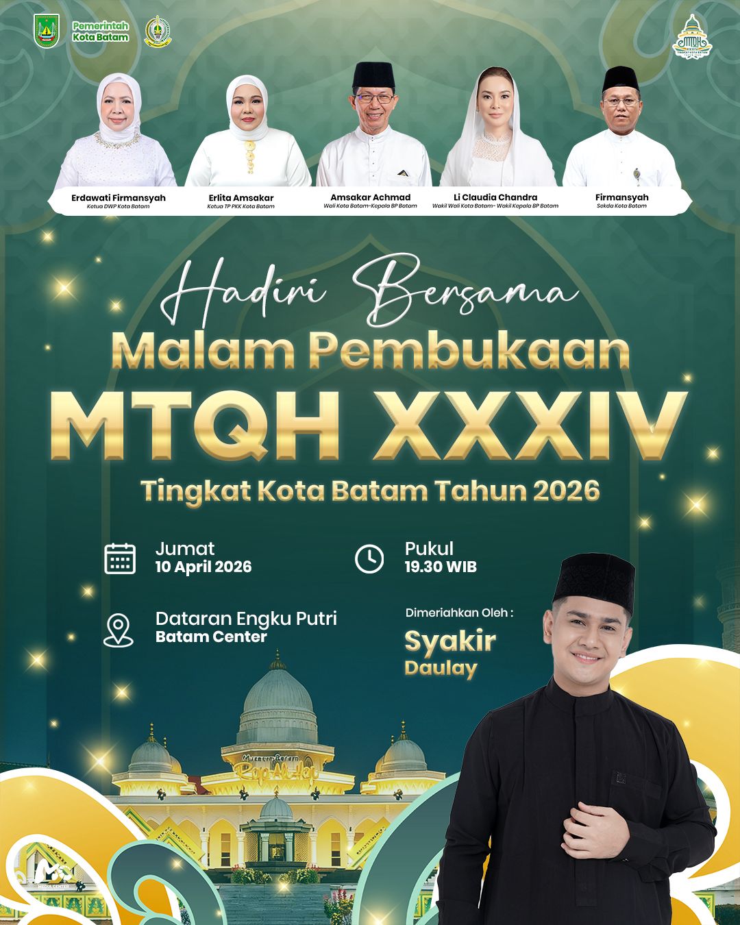 Pembukaan MTQH Tingkat Kota Batam ini dipusatkan di Dataran Engku Putri, Batam Center, dan akan berlangsung mulai pukul 19.30 WIB hingga selesai. MTQH tahun ini tidak hanya menjadi ajang syiar Islam dan pembinaan generasi Qur’ani, tetapi juga menghadirkan nuansa hiburan religi yang menarik bagi masyarakat.